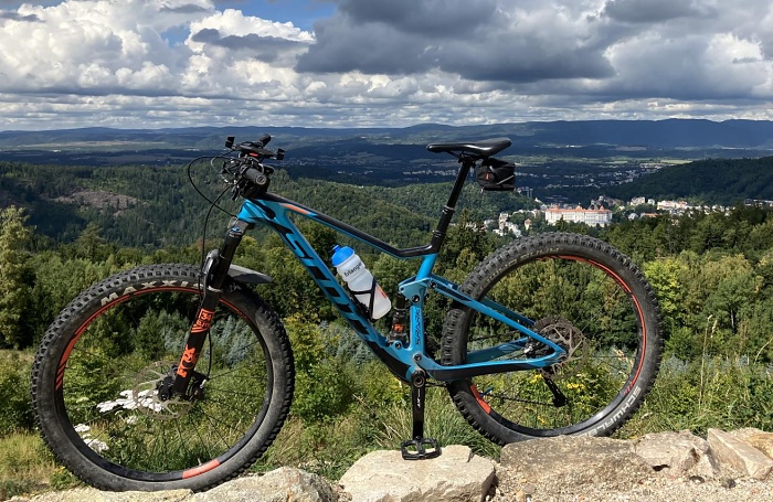 Scott Spark 710, modro-černé barvy, bílé nápisy MAXXIS na pneu, přední vidlice zn. FOX s oranžovým nápisem na černém podkladu.
