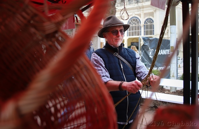 Své umění na kolonádě předvádí také mistr košíkář. Ten zájemce naučí, jak správně uplést velikonoční pomlázku, ale pro ty méně zručné má v nabídce i hotové kousky a další košíkářské zboží.