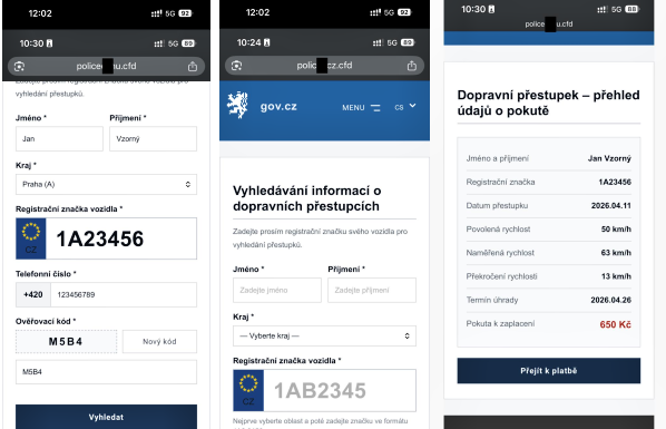 „Zaznamenali jsme další vlnu podvodných SMS zpráv. Pachatelé se vydávají za Policii ČR a snaží se vás přimět k zadání citlivých údajů z platební karty. Jak podvod vypadá? Přijde vám zpráva s výzvou k úhradě fiktivní pokuty za dopravní přestupek. Místo telefonního čísla se jako odesílatel zobrazuje e-mailová adresa. Odkaz vede na falešný portál napodobující oficiální stránky státní správy. Na platební bráně může být uvedena částka v Kč, ale je odečtena v jiné měně. Navíc mohou být údaje z platební karty dále zneužívány. Policie ČR pokuty tímto způsobem nevymáhá.“